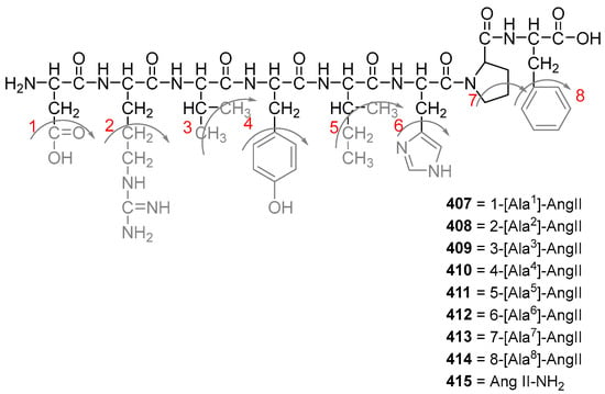 - Silva, A.F.; Silva, L.D.S.; Alves, F.L.; TorossianTorres, M.D.; de SáPinheiro, A.A.; Miranda, A.; LaraCapurro, M.; Oliveira, V.X. Effects of the angiotensin II Ala-scan analogs in erythrocytic cycle of Plasmodium falciparum (in vitro) and Plasmodium gallinaceum (ex vivo). Exp. Parasitol. 2015, 153, 1–7. [Google Scholar] [CrossRef]