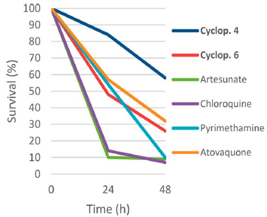 Angiotensin II hormones were also synthesized to investigate erythrocytic cycle invasion [33]. Peptides 426 and 427 exhibited >80% activity on P. gallinaceum and >40% activity on P. falciparum. The hemolytic effect, contractile response, and stability in human serum were determined (Figure 34), demonstrating that the peptides did not present hemolytic effects as they were inactive when compared to positive controls and were resistant to degradation in human serum after a prolonged exposure (6 h), especially peptides 426 and 427, which displayed excellent stability.