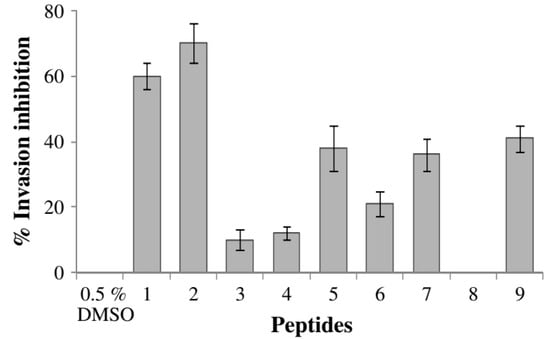 The effect of the peptides in the P. falciparum erythrocytic cycle was assessed in vitro. All peptides reduced new ring formation at 10−8 mol L−1, which was studied by Saraiva et al. as the ideal concentration for these inhibition assays. Four analogs reduced the ring formed in the blood stage, but only analogs 5 (401) and 6 (402) showed inhibition that was higher by 50% than control (Figure 27). Figure 27 showed that after 24 h of incubation with 2–3% schizont-infected erythrocyte cultures in the absence (control) or presence of 10−8 mol L−1 peptides, the percentage age of rings was evaluated (* p < 0.05 compared to the control, *** p < 0.001). The result is statistically significant compared to the (mean ± standard deviation, n = 2), as indicated by the dark grey shading [30].