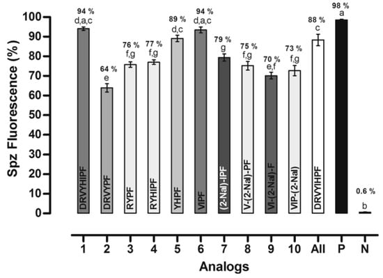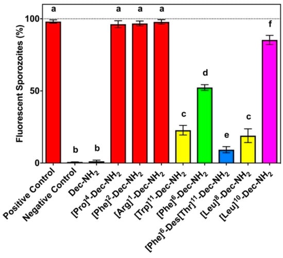 Effects of peptides on membrane permeability expressed as the percent of fluorescent mature sporozoites (mean ± standard deviation, n = 9). Letters indicate those results not significantly different from each other at the p < 0.05 level. Positive control group (+): digitonin/PBS; negative control group (−) Positive control group (+): digitonin/PBS: negative control group (−): PBS.