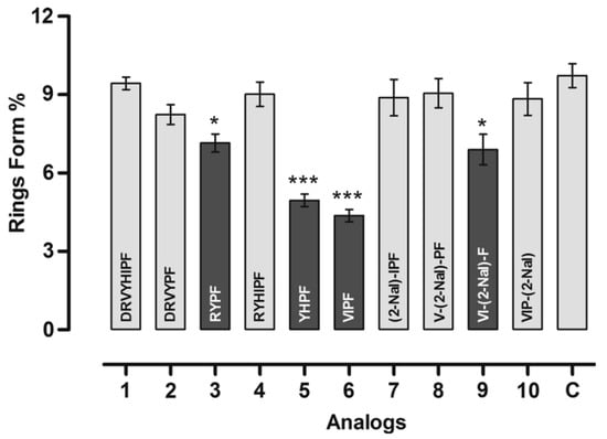 Effect of peptides in the new ring formation. * Statistically significant compared with control value p < 0.05. *** Statistically significant compared with control value p < 0.001. Analog 1 = 397; 2 = 398; 3 = 399; 4 = 400; 5 = 401; 6 = 402; 7 = 403; 8 = 404; 9 = 405; 10 = 406.