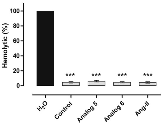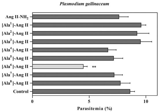 Regarding the contractile response, [Ala5]-Ang II and [Ala6]-Ang II did not promote contractile activity compared to Ang II, and carbachol [Ala5]-Ang II and [Ala6]-Ang II reduced parasite invasion in red blood cells in the erythrocyte hemolysis assays, and presented no effect on cells integrity at 10−8 M concentration. This model directs new possibilities for peptide design that can act more effectively in preventing the erythrocytic cycle of the parasite and other phases of the human–malaria cycle. Figure 32 demonstrates that after erythrocyte cultures were infected for 24 h with 3% parasitemia, the percentage of total parasites was determined in the absence (control) or presence of 10−8 M analogs. Dark grey shading denotes that the result is not statistically significant compared with control [31].
