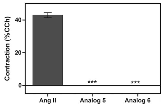 Effect of Ang II, peptide 5 (401) and 6 (402) on the contractile responses of muscle tissue compared to carbachol (CCh) activity. *** Statistically significant compared with control value p < 0.05 (mean ± standard deviation, n = 2)