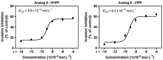 IC50 value for each assay. Peptide 5 (401) and 6 (402) were diluted in seven concentration [(10−4, 10−6, 10−8, 10−10, 10−12, 10−14) mol L−1] giving 7–65% inhibition.