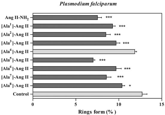 The synthesized RAS octapeptides were tested for their effectiveness against P. falciparum and P. gallinaceum, revealing that only [Ala5]-Ang II showed equipotent Ang II activity with 45% of biological activity [31]. At 10−8M concentration, P. gallinaceum erythrocytic cycle [Ala6]-Ang II decreased parasite invasion by 49%. The efficiency of anti-plasmodial activity was significantly impacted by the presence or absence of amino acid substitutions. The anti-plasmodial activity of the Ang II molecule depends on specific amino acid side chains. The biological activities and binding affinities are affected when the biologically active peptide is replaced by an alanine residue. From Figure 31, the percentage of rings was determined after 24 h of incubation of erythrocyte culture infected with 2–3% schizonts in the absence (control) or in the presence of 10−8 M analogs. Dark grey shading denotes that the result is statistically significant compared to the control.