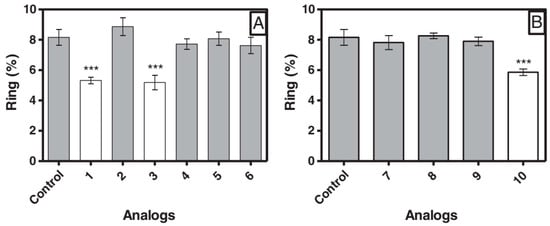 Effect of analogues in the new ring formation. * Statistically significant compared with control value p < 0.05. *** Statistically significant compared with control value p < 0.01. Dark grey shading indicates that the result is statistically significant compared with control.