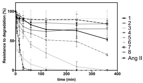 Stability of Ang II derivatives in human serum. Analog 1 = 426; 2 = 427; 3 = 428; 4 = 429; 5 = 430; 6 = 431; 7 = 432; 8 = 433.
