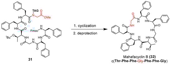 Synthesis of mahafacyclin B (32). Hydrophobically tagged Gly-OMe in compound 31 is highlighted in red. The untagged-glycine residue in compound 32 is highlighted in red.
