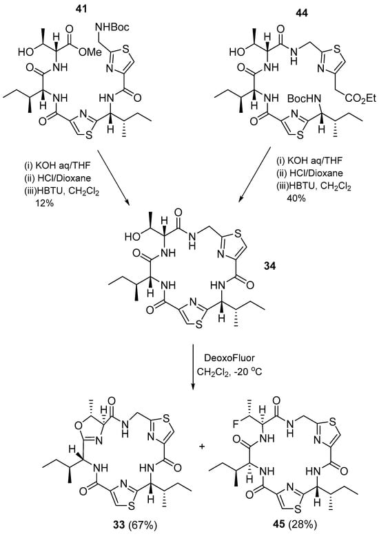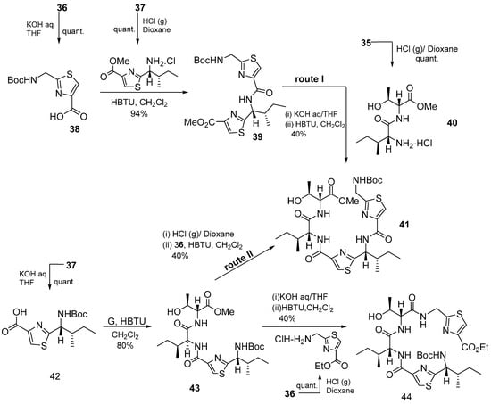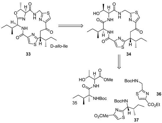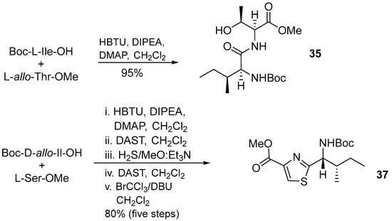 Aerucyclamide B (33) was synthesized by Peña et al. (2013) using two heterocycles and a dipeptide as building blocks (Scheme 2) [15]. Dipeptide 34 and thiazole 35 were synthesized in the first step and then HBTU was used as coupling reagent to produce the thiazole precursor 37 through cyclodehydration of β-hydroxythioamides and further oxidation methodology (Scheme 3).