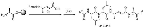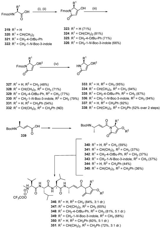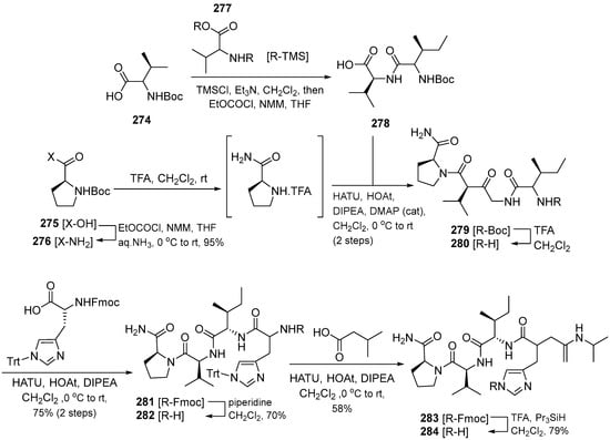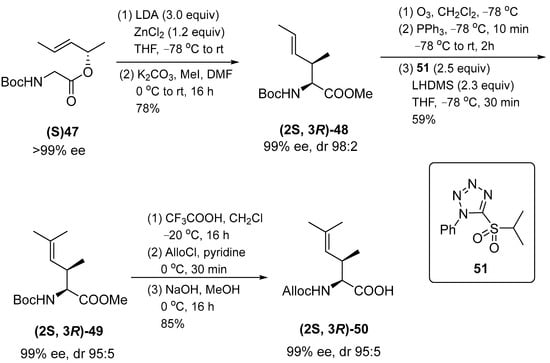 The peptide synthesis developed to obtain the required building blocks is based on long-term experience in amino acid synthesis. Amino acid chelate enolate esters are used to obtain β-hydroxy through an aldol reaction, whereas γ,δ-unsaturated amino acids are obtained by transition metal-catalyzed allylic alkylation or Claisen enolate chelate rearrangement and syn-isomers are obtained by Claisen rearrangement. Thus, this approach was used to produce the desired N-protected amino acid (2S,3R)-50 (Scheme 6).