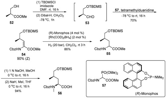 The protected 5-hydroxyleucine 56 was synthesized with the commercially available Roche ester 52. The compound was reduced to the aldehyde 53, and used in an olefination using Schimdt’s phosphonoglycinate 57. The α,β-unsaturated amino acid derivative obtained was stereoselectively hydrogenated with (R)-monophos as a ligand. Following N-methylation and saponification, amino acid 56 was produced with good yield selectivity (Scheme 7).