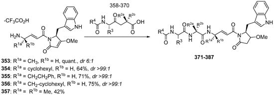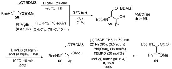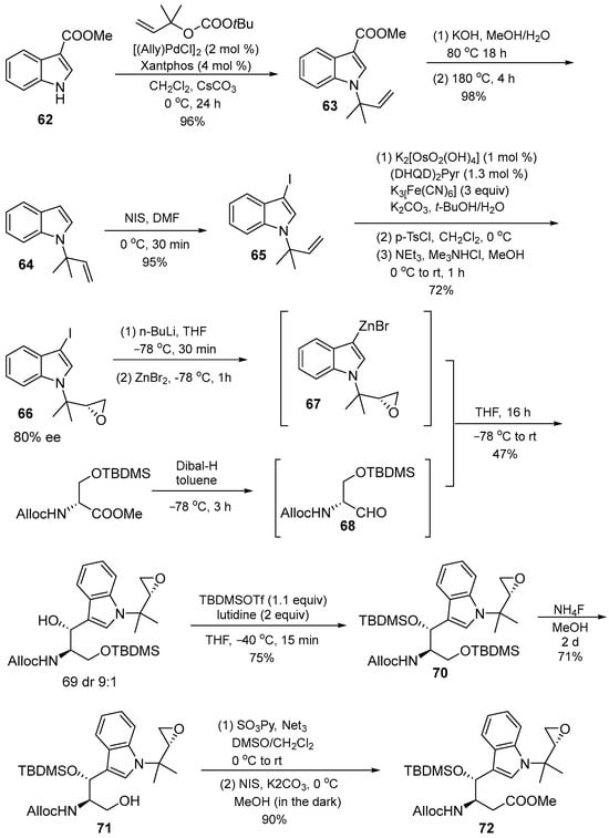 β-methoxyphenylalanine 61 is the third unusual building block that was prepared through several attempts shown in Scheme 8. The first attempt using phenylmagnesium bromide (3 equiv.) and DIBAL, which gave an acceptable yield of the addition products (60%), but only moderate diastereoselective products (7:3 ratio). Consequently, the titanium reagent was added as the single diastereomer. Subsequent O-Methylation, cleavage of the silyl ether, and oxidation then gave rise to an excellent yield of the target acid 61. Another method was also reported for regioselectively prenylated from electron-withdrawing indole. The Pd-catalyzed protocol to 3-indolecarboxylate 62 was applied resulting in indole 63. The reaction temperature was maintained at 0 °C to suppress N-prenylation, the ester was then saponified directly before the peptide coupling to avoid decomposition of the labile acid.
