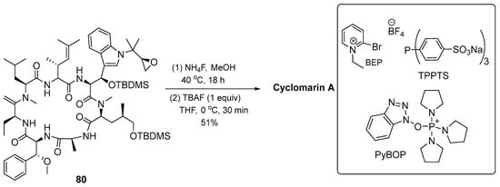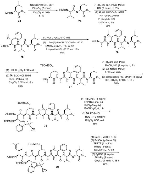 After obtaining the necessary building blocks, cyclomarin A was then synthesized. Ring closure was planned between aminohexenoic acid and N-methylated leucine. BEP (2-bromo-1-ethylpyridinium tetrafluoroborate) 80 was used for coupling with protected valine. HCl was applied to suppress DKP formation during synthesis. The dipeptide salt was coupled to the next peptide with the activated compound 47. The same protocol was then applied in the next coupling step. The HOBT reagent was used to activate N-methyl-4-hydroxyleucine 56 to avoid epimerization during the coupling reaction. This step obtained enantiomerically pure pentapeptide 77. The methyl ester 72 was saponified and directly coupled using the BEP protocol to obtain compound 78. Under Pd catalysis, the alloc protecting group was removed and combined with amino acid 50, then the deprotected heptapetide was slowly added to an aqueous solution of PyBOP and base in CH2Cl2 to obtain O-sylilated cyclomarin A 46 (Scheme 10) [16].