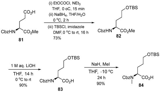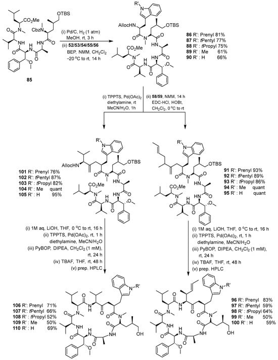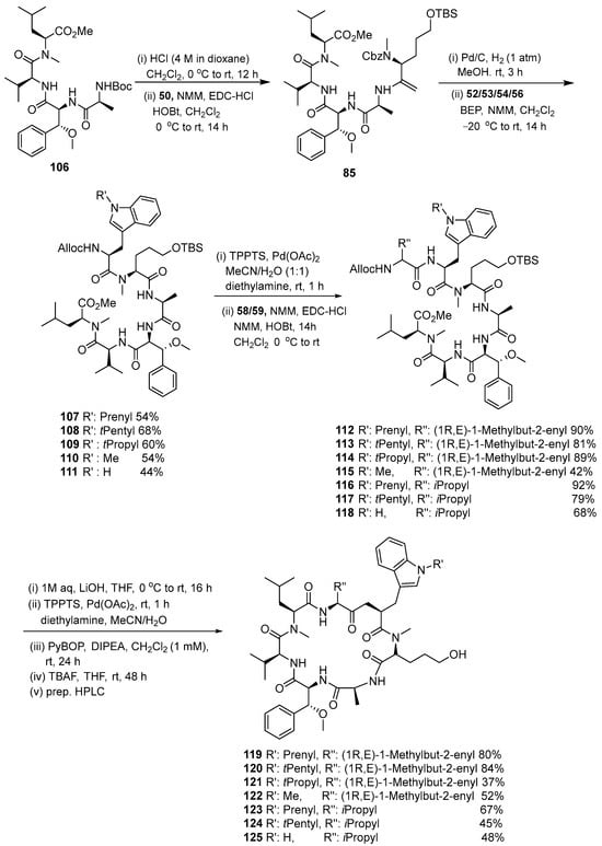 The synthesis of another cyclomarin was also reported by Kiefer et al. (2019). Seventeen desoxycyclomarin-inspired derivatives (96–100, 106–110, 119–125) were synthesized using a straightforward solution-phase approach [17]. First, an analog library was prepared stepwise by varying the N′-side chain of the tryptophan moiety followed by simplifying the aminohexenoic acid unit. A Negishi reaction served as key step for the generation of N′-isopropyltryptophan, with final saponification yielding the N′-isopropyltryptophan derivative. d-hydroxyleucine units were replaced by d-hydroxynorvaline for additional structural changes in the peptide backbone. The synthesized fragment with protected glutamic acid (81) was activated as mixed anhydride and then reduced with NaBH4. The alcohol produced as TBS ether gives compound 82, which is saponified and N-methylated to obtain N-methyl-d-hydroxynorvaline 84. The first step of synthesis is focused on linear precursor assembly with varying tryptophan motifs and hexenoic amino acids (Scheme 11).