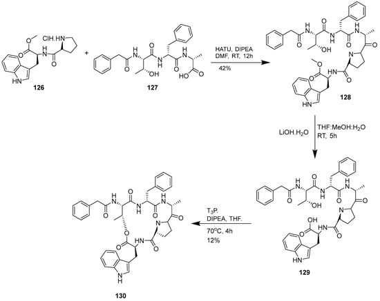 Gholap and Ugale (2017) reported the synthesis of chaiyaphumine-A (130) by convergent-based solution phase synthesis involving protection, deprotection, coupling and cyclization reactions [18]. This novel class of peptide will the subject of much research to develop new antimalarial drugs. Five amino acids, L-threonine, D-phenyl alanine, D-alanine, L-proline and L-tryptophan, were assembled by coupling reactions involving HATU. The macrocylization of the side chain (-OH) of L-threonine and C-terminus of carboxylic acid from L-tryptophan using T3P yields chaiyaphumine-A (Scheme 14).