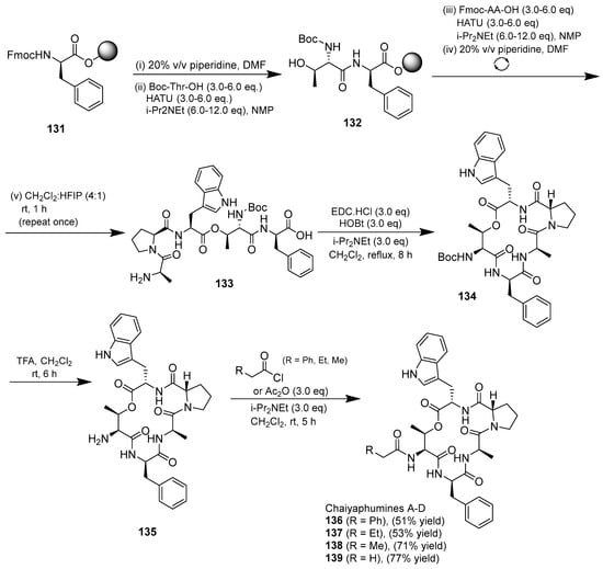The synthesis of chaiyapumines was also undertaken by Lu and Batey (2022) (Scheme 15). Fmoc-based solid-phase synthesis approaches were used for the synthesis of the requisite precursors. The solution-phase macrolactamization approach using EDC-HCl/HOBt was achieved without any detectable epimerization. This strategy was successfully applied for the total synthesis of the antimalarial compound chaiyaphumine A, as well as the natural products chaiyaphumine B, C, and D (136–139) using a late-stage acylation of the threonine amino group [19].