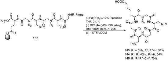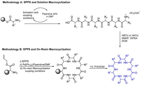 Fagundez et al. (2018) investigated the synthesis of a cyclopeptide using solid-phase peptide synthesis and on-resin macrocyclization, with various analytical techniques used to monitor reactions and purify compounds [20]. The investigation compared solution- and solid-phase ring-closing reactions following the synthesis of linear precursor on a 2-chrotrytil chloride resin (Scheme 16). Method A applied a combination of the solid-phase (linear precursor) and the solution-phase methods (macrocylization), whereas method B involved all reactions on-resin. A combination of DIC and Cl-HOBt as a coupling agent was used when the next amino acid added was Fmoc-L-Cys(Trt)-OH because it does not require the addition of a base and can decrease potent racemization. The solution-phase macrocyclization involved HBTU or HATU in the presence of DIPEA in DCM. The final products were obtained in moderate to good yields 26–80%.