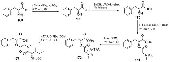 The antimalarial mahafacyclin B (32) is a cyclic heptapeptide that was synthesized by Fujita et al. (2013) using the soluble-tag assisted liquid–phase method [14]. This method allowed peptide head-to-tail cyclization leading to the total synthesis of mahafacyclin B assisted by hydrophobic benzyl alcohol. The synthesis was initiated by reductive amination of hydrophobic benzaldehydes using amino acid methyl esters to obtain hydrophobically tagged Gly-Ome from its reaction with coupling reagent Fmoc-Phe-OH, and a combination of HATU, HOAt, DIPEA, and THF. Basic deprotection of the hydrophobically tagged dipeptide produces diketopiperazine when the C-terminal residue is proline. The hydrophobically tagged tripeptide was deprotected to obtain the cyclized compound (Scheme 1). A less polar solvent was employed during cyclization to overcome the issue of the highly hydrophobic residues in the linear precursor. The amide nitrogen was used as the marking site allowing the rapid reaction checks and product isolation.