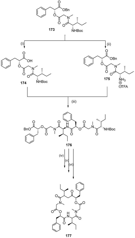 - Gholap, S.S.; Ugale, S.R. A Total Synthesis of the Cyclic Depsipeptide Chaiyaphumine-A. ChemistrySelect 2017, 2, 7445–7449. [Google Scholar] [CrossRef]