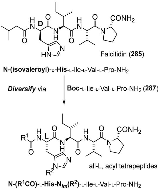- Kotturi, S.R.; Somanadhan, B.; Ch’Ng, J.H.; Tan, K.S.W.; Butler, M.S.; Lear, M.J. Diverted total synthesis of falcitidin acyl tetrapeptides as new antimalarial leads. Tetrahedron Lett. 2014, 55, 1949–1951. [Google Scholar] [CrossRef]