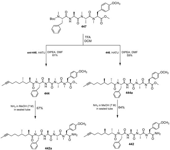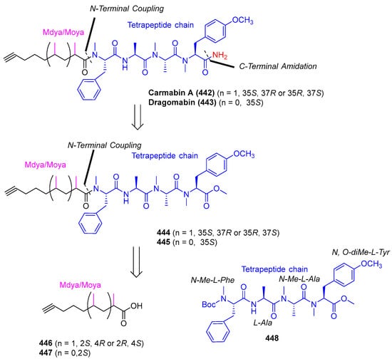 - Ye, B.; Jiang, P.; Zhang, T.; Sun, Y.; Hao, X.; Cui, Y.; Wang, L.; Chen, Y. Total synthesis of the highly N-methylated peptides carmabin a and dragomabin. Mar. Drugs 2018, 16, 338. [Google Scholar] [CrossRef] [PubMed]