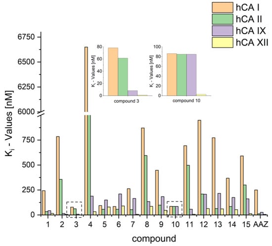 Depiction of Ki values for compounds 1–15 and AAZ.