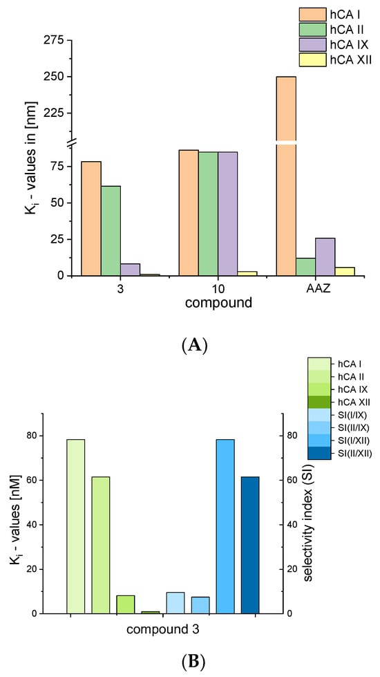 (A): Comparison of Ki values for compounds 3 and 10 and standard acetazolamide (AAZ); (B): comparison of Ki values for compound 3 with respect to isoforms of hCA.