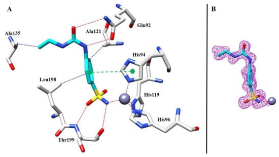 Regarding the complex between 8 and hCA I, after the initial rounds of refinement, the calculated Fo-Fc map showed, inside the active site, a clear electron density that was compatible with the sulfonamide moiety (Figure 6B), which interacts directly with the zinc atom in the active sites. In addition, the sulfonamide group formed the characteristic hydrogen bond with residue Thr199, stabilizing the complex, which is typical of this class of inhibitors (Figure 6A).