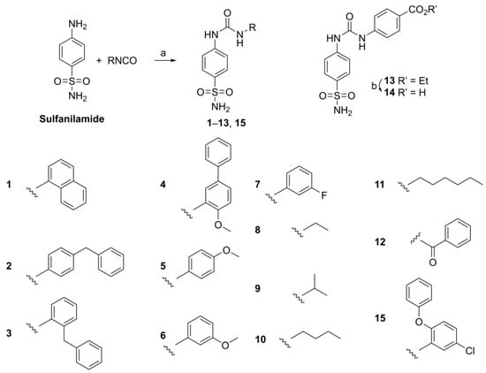 Starting from a readily available starting material, compounds 1–15 were synthesized (Scheme 1) as previously described via the reaction of sulfanilamide with isocyanates [21]. This approach is especially suited for accessing the target compounds when the isocyanate is readily available. Recently, an alternative one-pot procedure has been published [28].