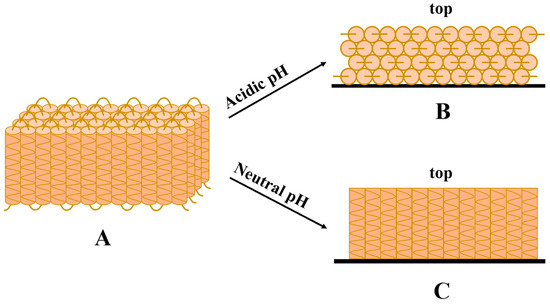 Organic acids can donate and accept electrons, form hydrogen bonds between them and prolamins, and dissolve prolamins at lower heating temperatures (or normal temperatures), and form thinner and more uniform films [25]. Films made with alkaline solutions may have better mechanical strengths than those made with acidic solutions [46]. Matsushima et al. [47] proposed a hypothesis for the structural model of α-zein: it is composed of multiple α-helical repeating sequence units arranged side by side and connected in series (Figure 2A). Based on this model, Shi et al. [48] analyzed the structures of zein-based films formed with different solvents and concluded that the conformational reorganization of zein molecules varies during solvent evaporation, largely depending on the pH value of the system. In an acidic (e.g., glacial acetic acid) environment, zein molecules tend to lie flat and the hydrophobic side is in contact with the air due to electrostatic attraction, leading the zein-based film to have relatively lower surface roughness and higher hydrophobicity (Figure 2B). In a neutral (e.g., aqueous ethanol) environment, zein molecules tend to be arranged vertically and the polar AA residues at the top are in contact with the air due to the weak electrostatic repulsion between zein molecules and the carrier, leading the zein-based film to have relatively higher surface roughness and worse hydrophobicity (Figure 2C). However, when acidic solvents are used as food coatings for preservation, those acidic components remain on the products accompanying coatings during storage and decompose and dissolve during cooking or chewing, which may affect the pH value of food systems and even bring undesirable organoleptic properties to the coated foods.