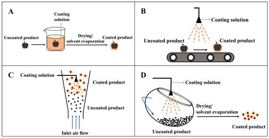 The dipping coating method is currently the main method in laboratory coating application and also the most common method for food coating due to its simple operation and low cost. The dipping method is generally divided into three steps: firstly, foods are immersed into the coating solution for a while to ensure that foods are exposed to a sufficient amount of coating solution and the contacting time between foods and coating solution is long enough; secondly, foods are taken out and left to stand still, and a thin layer of coating is formed on the surface of foods due to surface tension; thirdly, foods are dried at room temperature or under heated conditions, and then a dry film is formed on the surface of foods after evaporating solvents (Figure 3A). The dipping and drying steps can also be cycled alternately if necessary [51]. The dipping method can be used to completely coat the foods with uneven surface or complex shape, but it may cause the dilution of the coating solution. When the adhesion of the coating solution on the surface of foods is poor, multiple soakings may be required to ensure the complete coating of foods, or a complete coating may not even be obtained [52]. Cisneros-Zevallos and Krochta [53] used the dipping method to coat apples and found that the coating thickness of regular objects (flat plates) has a close relationship with the viscosity, density, and solvent evaporation rate of the coating solution, and the relationship is also applicable to irregular objects (apple). However, the coating formed on the surface of a non-horizontal plane or an irregular object by the dipping method has uneven thickness due to the fluidity of coating forming liquid. It is difficult for the dipping method to be applied for massive continuous production in practice.
