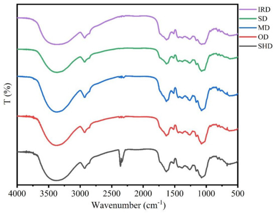 The intensity, shape and position of FT-IR spectra peaks from samples prepared with five drying methods were used to compare the differences and similarities (Figure 3). It could be observed that the chemical profiles of SPF samples dried by different methods were similar owing to the similarity of the FT-IR spectra. The characteristic absorption peaks of glycosides, including echinacoisde, forsythoside B, verbascoside and oleuropein, could be found in the FT-IR spectra. On the other hand, differences in the positions and intensities in the FT-IR spectra were found in the 1700–850 cm−1 wavenumber regions. The changes in position and intensity of the absorption peaks revealed the differences in component contents of samples prepared by the five drying methods. Compared with other drying methods, the absorption bands of samples treated with IRD at 1634–1632 cm−1, 1517–1512 cm−1, 1382–1378 cm−1, 1263–1256 cm−1, 1157–1152 cm−1, 1074–1066 cm−1, 927 cm−1 and 860–858 cm−1 were low, suggesting that the active compounds might be degraded after the IRD process.