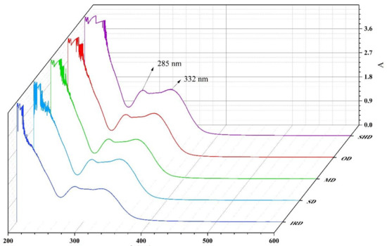 The UV-Vis spectra of the ethanol extract of five samples are illustrated in Figure 4. The peaks at 285 and 332 nm can be associated with the presence of oleuropein and phenylethanoid glycosides, respectively [18,19]. It could be observed that the bands associated with the major compounds of SPF extract after different drying methods were similar. However, there were some variations in the absorbance values of samples prepared using the different drying methods.