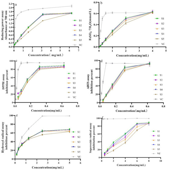 Antioxidant activities of SPF under different drying methods. (a) Reducing power, (b) FRAP, (c) DPPH, (d) ABTS, (e) •OH, (f) Superoxide radical. Note: S1: SHD; S2: OD; S3: MD; S4: SD; S5: IRD. (Similarly, hereinafter).