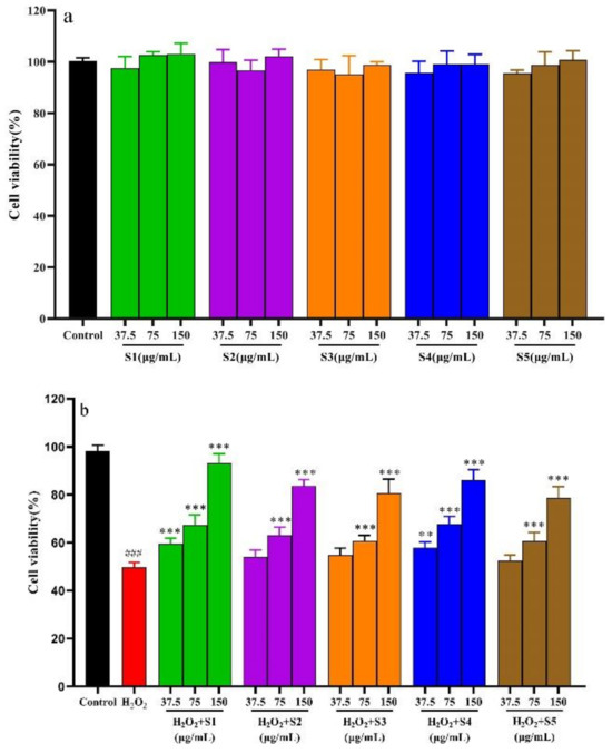 The cytotoxicity of the SPF extract is shown in Figure 6a. It could be found that the cell viabilities treated by the SPF extract were more than 95% at the tested concentration (37.5 μg/mL, 75 μg/mL and 150 μg/mL), indicating that the SPF extract had noncytotoxicity on L02 cells [20]. Therefore, the SPF extract concentrations of 37.5 μg/mL, 75 μg/mL and 150 μg/mL were used in the following investigation.