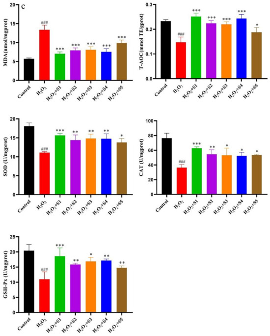 The levels of intracellular ROS and ROS scavenging abilities of SPF are given in Figure 7a–h. The highest intracellular ROS level was found in the H2O2 group among the test groups (Figure 6c). Compared to the H2O2 group, the intracellular ROS level in the SPF groups significantly decreased (p < 0.05). Meanwhile, the intracellular ROS level in the SHD group was the lowest (Figure 7a,b). These results indicated that SPF could scavenge the intracellular ROS. Similar results were obtained by Shen et al. [22], who confirmed that phenylethanoid glycosides from Incarvillea compacta possessed intracellular ROS scavenging capacities.