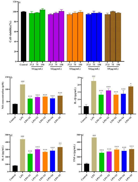 The cytotoxicity of SPF extract on RAW264.7 cells is shown in Figure 8a. Compared with the control group, the viability of RAW264.7 cells exceeded 90%, suggesting SPF extract (37.5, 75, 150 μg/mL) showed non-cytotoxicity to RAW264.7 cells.