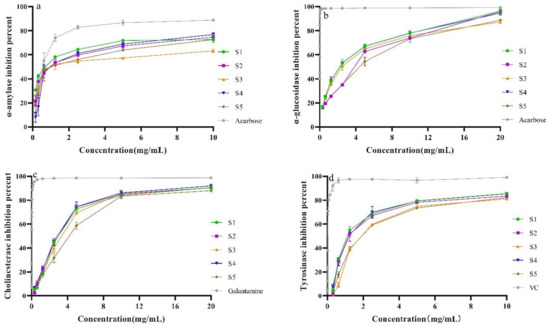 Enzyme inhibitory potentials. (a) α-amylase inhibitory activity of SPF; (b) α-glucosidase inhibitory activity of SPF; (c) AChE inhibitory activity of SPF; (d) Tyrosinase inhibitory activity of SPF.
