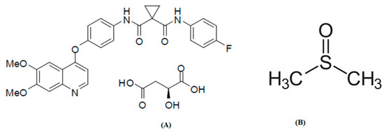 Chemical structures of (A) cabozantinib malate (CBZM) (taken from Ref. [2]) and (B) dimethyl sulfoxide (DMSO) (taken from https://en.wikipedia.org/wiki/Dimethyl_sulfoxide; accessed on 15 October 2023).