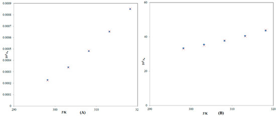 where the Equation (5) model coefficients were obtained using nonlinear multiple regression analysis based on the experimental CBZM solubility values displayed in Table 1 [47]. The outcomes from CBZM’s xe and xApl were connected in terms of RMSD. Utilizing Equation (6), the Buchowski–Ksiazczak λh solubility (xλh) of CBZM in cosolvent mixtures and neat solvents was derived [37,38]: