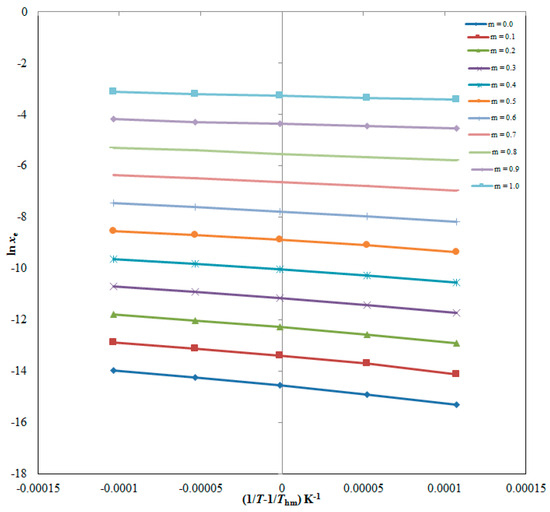 van’t Hoff graphs at the mean harmonic temperature (Thm) for CBZM graphed between ln xe and 1/T − 1/Thm for CBZM in numerous DMSO aqueous solutions (m = 0.0–1.0) to calculate various thermodynamic parameters.