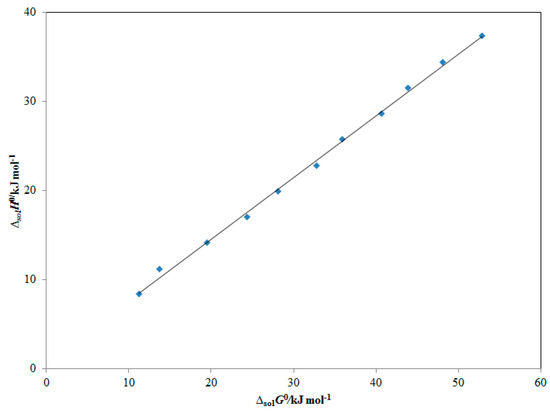 An enthalpy–entropy compensation analyses was performed, as previously described [18], to assess the solvation behavior of CBZM in cosolvent mixtures and neat solvents. Weighted curves of ΔsolH° vs. ΔsolG° were constructed at Thm = 308 K for this experiment [52,53].
