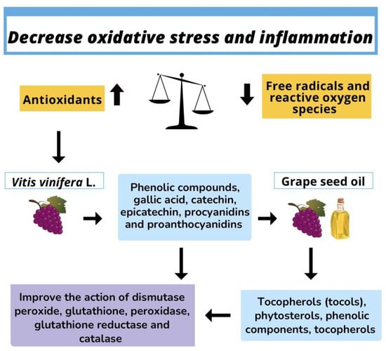 Much effort is made in today’s research to verify the consequences in biology and medicine, besides seeking ways to minimize or avoid the imbalance between oxidants and antioxidants in an attempt to fight oxidative stress and inflammation [54]. Among the endogenous antioxidant compounds that best combat oxidative stress there are dismutase peroxide, glutathione, peroxidase, glutathione reductase, and catalase; among the exogenous antioxidants are vitamin E, carotenoids, polyphenols, and vitamin C [56]. Vitis vinifera contains various bioactive compounds that can enhance antioxidant and anti-inflammatory actions, such as high levels of phenolic compounds gallic acid, catechin, epicatechin, procyanidins, and proanthocyanidins (Table 4) [57].