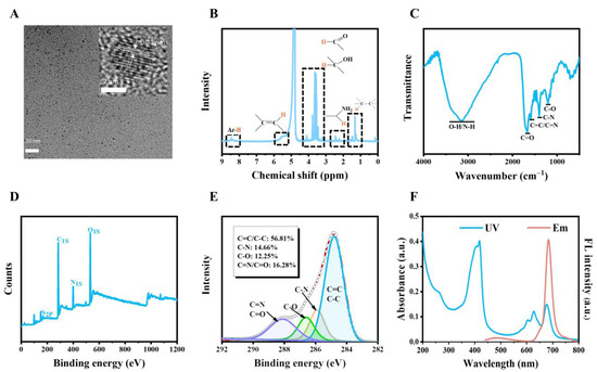 Characterization of CDs. (A) The TEM image of CDs. Scale bar: 20 nm. The inset is the HR-TEM image and lattice of the CDs. Scale bar: 2 nm. (B) 1H NMR spectrum of the CDs. (C) FT-IR spectrum of the CDs. (D) The XPS results of the CDs. (E) High resolution of C 1s with identification of peaks by curve fitting of the CDs. (F) The UV spectrum and the fluorescence emission spectrum of CDs (10 μg/mL, ultrapure water).
