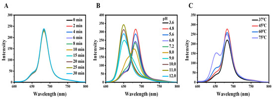 Next, the fluorescence responses of CDs toward light, pH, and temperature were investigated. The fluorescence of CDs was relatively stable within 30 min under the continuous excitation of an LED lamp with 800 W (Figure 2A), indicating the good photostability of CDs. The fluorescence spectrum of CDs did not change significantly under the pH ranging from 3.6 to 6.8 except for a slight change in intensity. However, when the pH further increased, the fluorescence spectrum of CDs changed dramatically (Figure 2B). The fluorescence intensity at 649 nm gradually increased with the maximum intensity at pH 11, while that at 684 nm decreased (Figure 2B). The pH-sensitive fluorescence of CDs was assumed to be the protonation/deprotonation and tautomerism between emission site structures [34,35]. Moreover, when the temperature increased from 37 to 75 °C, the fluorescence intensity of CDs at 684 nm decreased while the fluorescence intensity at 649 nm increased (Figure 2C). This phenomenon is more likely to occur at high temperatures and may be attributed to deprotonation, which is consistent with the pH-sensitive fluorescence of CDs.