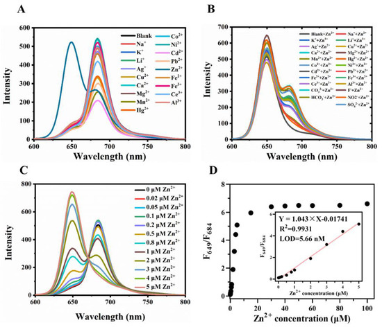 Performance of the CDs for detection of zinc ions. (A) Fluorescence spectra of the CDs (10 μg/mL, ultrapure water) upon addition of different metal ions (2 μM) with excitation at 420 nm. (B) Fluorescence spectra of the CDs (10 μg/mL, ultrapure water) with excitation at 420 nm after zinc ions (2 μM) and the indicated substrates (2 μM) were added. (C) Fluorescence spectra of the CDs (10 μg/mL, ultrapure water) in the presence of zinc ions with different concentrations under excitation at 420 nm. (D) The value of the ratio of fluorescence intensity at 649 nm to that at 684 nm (F649/F684) of the CDs (10 μg/mL, ultrapure water) in the presence of zinc ions with different concentrations (0–100 μM). The inset is the linearity of F649/F684 to zinc ion concentration.