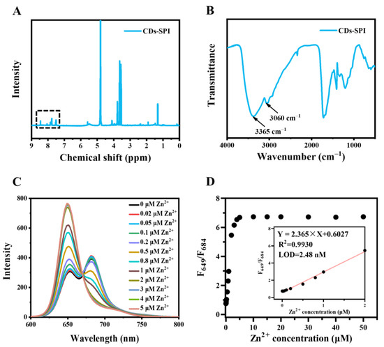 Characterization of CDs-SPI. (A) 1H NMR spectrum of CDs-SPI. (B) FT-IR spectrum of CDs-SPI. (C) Fluorescence spectra change in CDs-SPI (10 μg/mL, ultrapure water) upon addition of different concentrations of zinc ions with excitation at 420 nm light. (D) F649/F684 of CDs-SPI (10 μg/mL, ultrapure water) to zinc ions concentration (0–50 μM). The inset is the linearity of F649/F684 to zinc ions concentration.