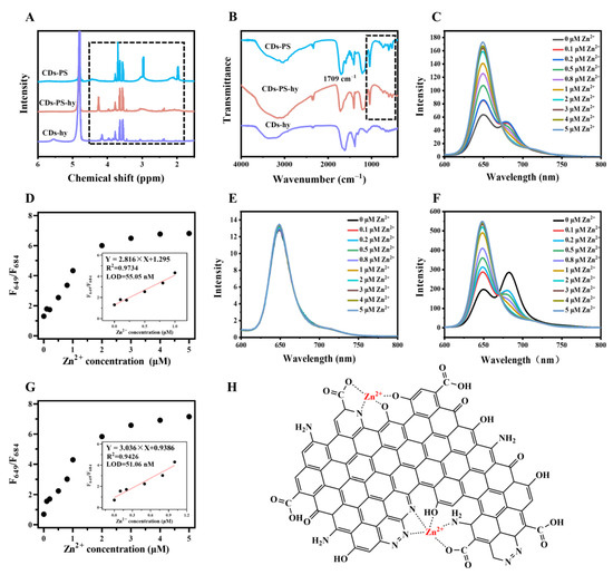 Characterization of CDs-PS, CDs-PS-hy and CDs-hy. (A) The 1H NMR spectra of CDs-PS, CDs-PS-hy, and CDs-hy. (B) The FT-IR spectra of CDs-PS, CDs-PS-hy, and CDs-hy. (C) Fluorescence spectra change in CDs-PS (10 μg/mL, ultrapure water) upon addition of different concentrations of zinc ions with excitation at 420 nm light. (D) F649/F684 of CDs-PS (10 μg/mL, ultrapure water) to zinc ions concentration (0–5 μM). The inset is the linearity of F649/F684 to zinc ions concentration. (E) Fluorescence spectra change in CDs-PS-hy (10 μg/mL, ultrapure water) upon addition of different concentrations of zinc ions with excitation at 420 nm light. (F) Fluorescence spectra change in CDs-hy (10 μg/mL, ultrapure water) upon addition of different concentrations of zinc ions with excitation at 420 nm light. (G) F649/F684 of CDs-hy (10 μg/mL, ultrapure water) to zinc ions concentration (0–5 μM). The inset is the linearity of F649/F684 to zinc ions concentration. (H) Expected high affinity and selectivity for zinc ions.