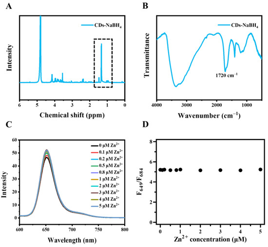 Characterization of CDs-NaBH4. (A) The 1H NMR spectrum of CDs-NaBH4. (B) The FT-IR spectrum of CDs-NaBH4. (C) Fluorescence spectra change in CDs-NaBH4 (10 μg/mL, ultrapure water) upon addition of different concentrations of zinc ions with excitation at 420 nm light. (D) F649/F684 of CDs-NaBH4 (10 μg/mL, ultrapure water) to zinc ions concentration (0–5 μM).