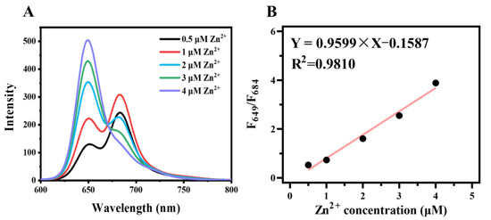 The application of CDs in real samples. (A) Fluorescence spectra change in CDs (10 μg/mL, 1.2 mg/mL of milk powder solution) at 420 nm excitation upon addition of different concentrations of zinc ions. (B) The linearity of F649/F684 of CDs (10 μg/mL, 1.2 mg/mL of milk powder solution) to zinc ions concentration.